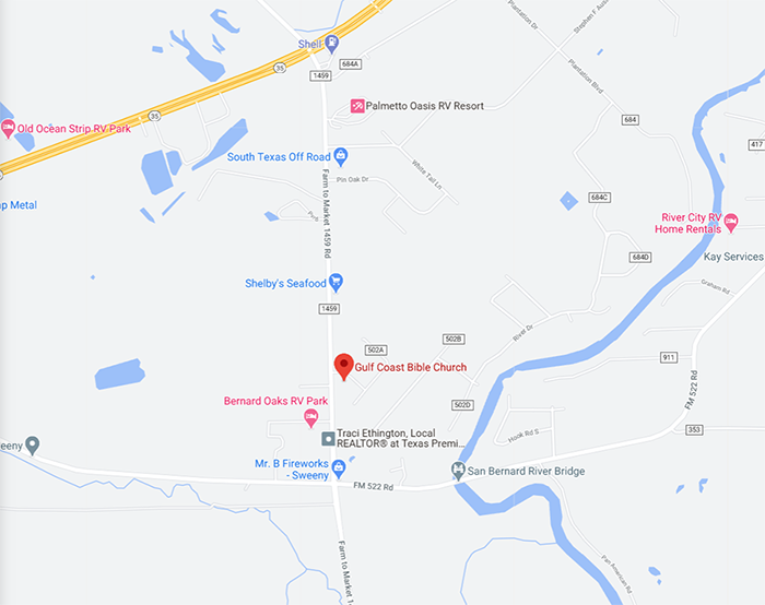 From Highway 35, head south on FM1459. Travel about 3/4 mile and you'll see the church on the left side of the street. Watch for our church sign.